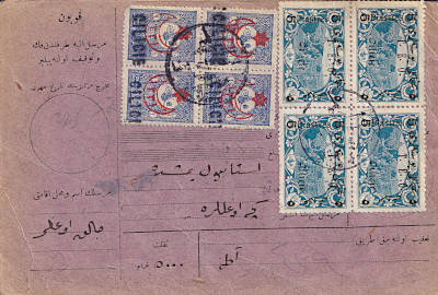Postal order (5000 Piaster) from 02.08.1919 from Adana franked with 4 postage stamps of 1 Piaster with Large block stamp and 4 postage stamps a 5 Piaster with typographed overprint |