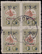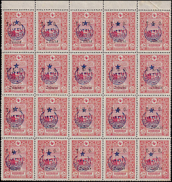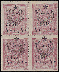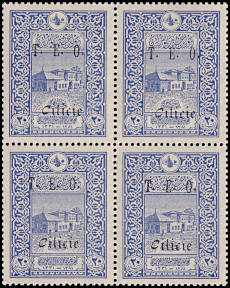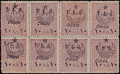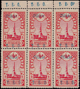 block of 6 with split overprint without "Cilicie" in the top line, with "Dot" in the 2nd line right and "ITI" in the 3rd line left |