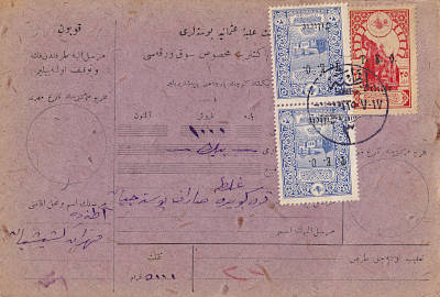 Postal order (5000 Piaster) from 15.05.1920 from Adana franked with one postage stamp a 25 Piaster and 2 postage stamps a 20 Para all with typographed overprint |