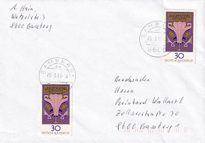 Inlandsdrucksache (1-20 g) vom 26.03.1993 (10. Periode) frankiert mit 2 Marken a 30 Pfennig (=60 Pfennig) |
