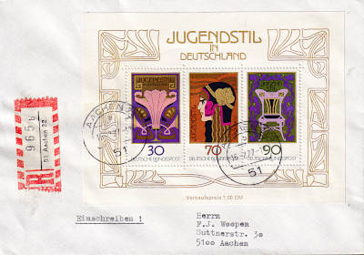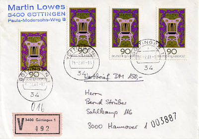 Inlandsbrief mit Wertangabe (150 DM) (16 g) vom 19.07.1981 (8. Periode) frankiert mit 4 Marken a 90 Pfennig (=3,60 Mark, 0,60 Brief 3 Wert) |