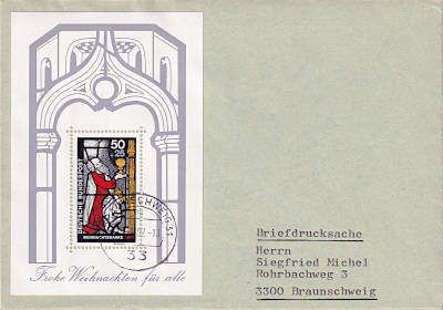 Inlandsbriefdrucksache (1-20 g) vom 10.02.1982 (8. Periode) frankiert mit einem Block a 50 Pfennig (=50 Pfennig) |