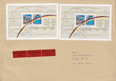 Ortsbrief mit Eilzustellung (21-50 g) vom 30.03.1991 (10. Periode) frankiert mit 2 Blocks a 1,50 Mark (=3 Mark, 1 Brief 2 Eilzustellung) |