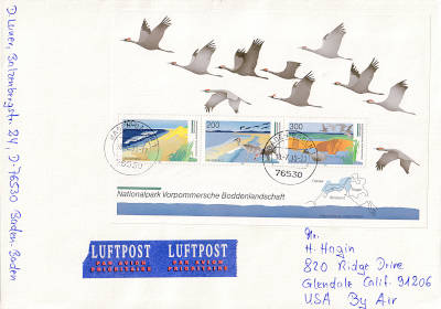Auslandsbrief mit Luftpost (1-50 g) vom 18.07.1996 (11. Periode) frankiert mit einem Block a 6 Mark (6 Mark)