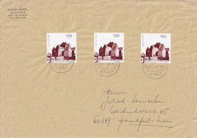 Inlandsbrief (51-500 g) vom 08.08.1997 (11. Periode) frankiert mit einem Block a 3 Mark (=3 Mark) |