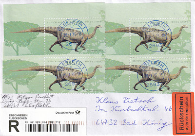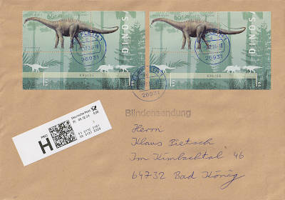 Inlandsbrief mit Einwurf-Einschreiben (1-20 g) vom 08.06.2021 (10. Periode) frankiert mit einem Block a 3 € (=3 €, 0,80 Brief 2,20 Einwurf-Einschreiben) |
