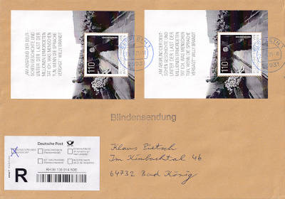 Inlandsblindensendung mit Einwurf-Einschreiben vom 25.05.2021 (10. Periode) frankiert mit 2 Blocks a 1,10 € (=2,20 €,