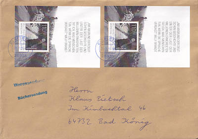 Inlandsbüchersendung (501-1 000 g) vom 20.07.2021 (10. Periode) frankiert mit 2 Blocks a 1,10 € (=2,20 €)