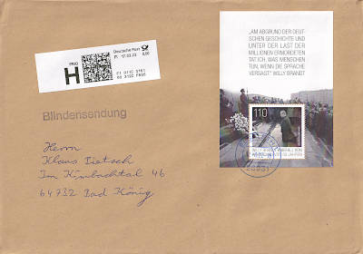 Inlandsblindensendung mit prioritärer Behandlung vom 17.03.2022 (11. Periode) frankiert mit einem Block a 1,10 € (=1,10 €,