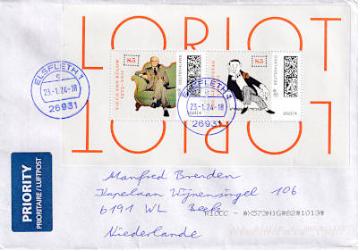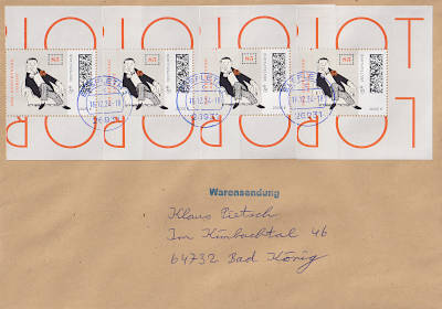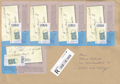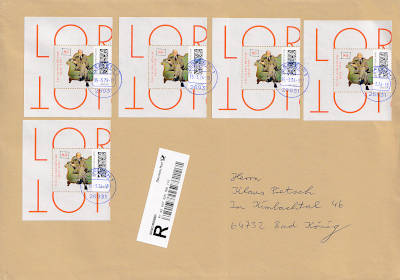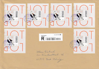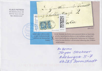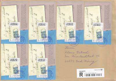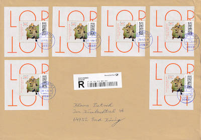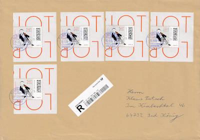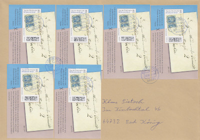 (501-1 000 g) vom 23.01.2024 (11. Periode) frankiert mit 6 Blocks a 0,85 € (=5,10 €,