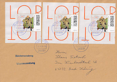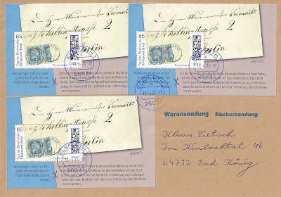 Inlandswarensendung (501-1 000 g) vom 19.04.2024 (11. Periode) frankiert mit 3 Blocks a 85 Cent (=2,55 €)