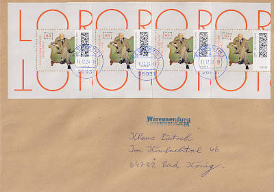 Inlandswarensendung (1 0001-2 000 g) vom 16.12.2024 (11. Periode) frankiert mit 4 Marken a 0,85 € (=3,40 €)