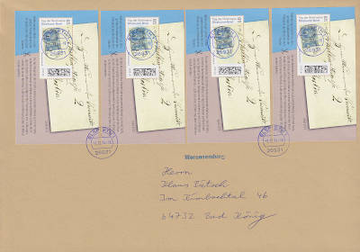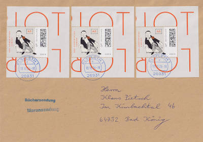 (501-1 000 g) vom 19.04.2024 (11. Periode) frankiert mit 3 Blocks a 1,70 € (=5,10 €,