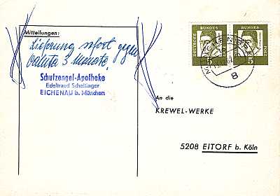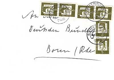 Inlandsbrief (21-50 g) vom 12.03.1964 (3. Periode) frankiert mit 8 Marken a 5 Pfennig (=40 Pfennig) |