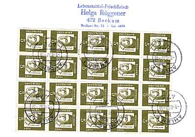 unterfrankierter Inlandsbrief (22 g) vom 02.03.1964 (3. Periode) frankiert mit 4 Marken a 5 Pfennig (=20 Pfennig; 50 Nachgebühr = 20 fehlendes Porto 30 Strafgebühr) |