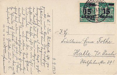 Local postcard from 05.09.1923 (17. Period) franked with one stamp a 15 000 Mark on 40 Mark (=15 000 Mark) |