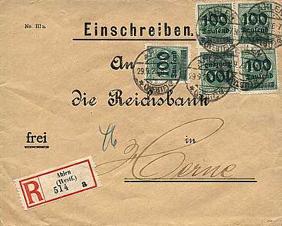 Inland cover with registeration (1-20 g) from 29.09.1923 (18. Period) franked with 5 stamps a 100 000 Mark on 400 Mark (=500 000 Mark, 250 000 cover 250 000 registeration) |