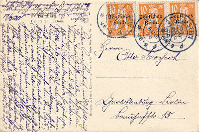 Inland postcard from 20.08.1920 (5. Period) franked with 3 stamps a 10 Pfennig (=30 Pfennig) |