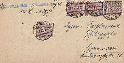 Inlandsbrief mit Nachnahme (1-20 g) vom 24.04.1920 (4. Periode) frankiert mit 3 Marken a 15 Pfennig (=45 Pfennig, 20 Brief 25 Nachnahme)