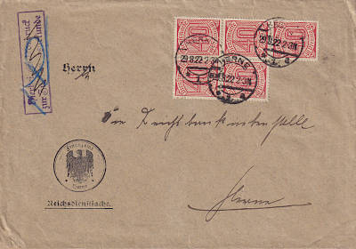 Local cover (21-100 g) from 29.08.1922 (8. Period) franked with 5 stamps a 40 Pfennig (=2 Mark) |