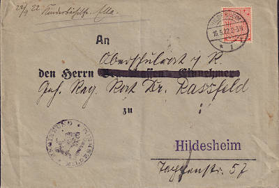 Local cover (1-20 g) from 16.09.1922 (8. Period) franked with one stamp a 1 Mark (=1 Mark) |