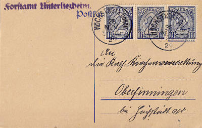 Inland postcard from 28.11.1922 (10. Period) franked with 3 stamps a 2 Mark (=6 Mark) |