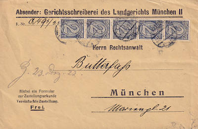Inland cover (1-20 g) from 26.11.1922 (10. Period) franked with 6 stamps a 2 Mark (=12 Mark) |