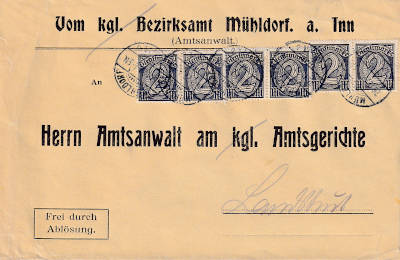 Local cover (1-20 g) from 25.01.1923 (12. Period) franked with 10 stamps a 2 Mark (=20 Mark) |