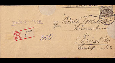 Inlandsbrief mit Einschreiben (1-20 g) vom 10.08.1922 (8. Periode) frankiert mit einer Marke a 5 Mark (=5 Mark, 3 Brief 2 Einschreiben) |
