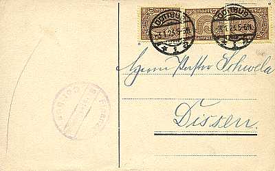Inlandspostkarte vom 03.01.1923 (11. Periode) frankiert mit 3 Marken a 5 Mark (=15 Mark) |