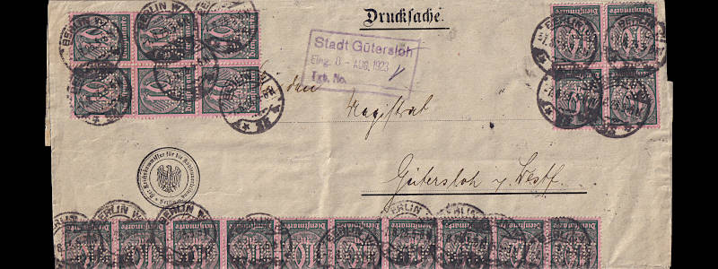 Local cover (1-20 g) from 12.02.1923 (12. Period) franked with 2 stamps a 10 Mark (=20 Mark) |