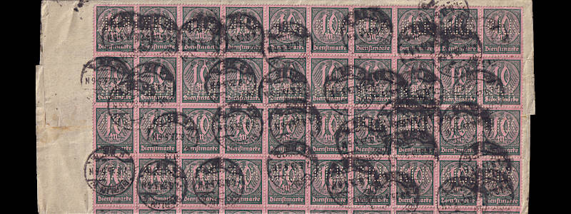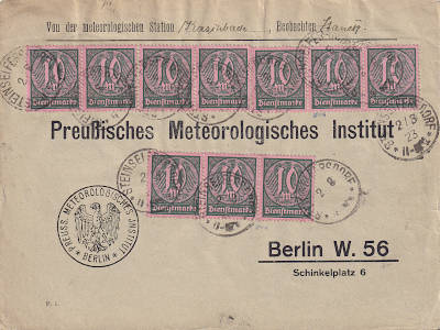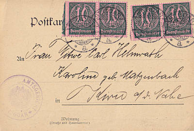 Inland cover with affidavit of service (1-20 g) from 23.11.1922 (10. Period) franked with 3 stamps a 10 Mark (=30 Mark, 12 cover 6 delivery 12 document) |