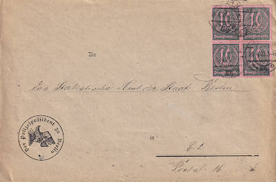 Local cover (1-20 g) from 26.04.1923 (13. Period) franked with 4 stamps a 10 Mark (=40 Mark) |