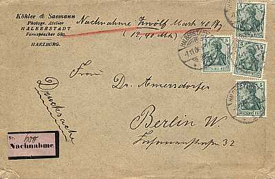 Inland printed matter with cash on delivery (101-250 g) from 07.11.1906 (1. Period) franked with 4 stamps a 5 Pfennig (=20 Pfennig, 10 printed matter 10 cash on delivery) |