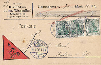 Inland postcard with cash on delivery from 15.09.1909 (1. Period) franked with 3 stamps a 5 Pfennig (=15 Pfennig, 5 postcard 10 cash on delivery) |