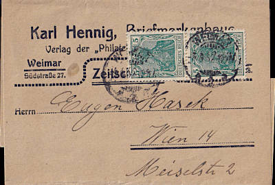 Foreign printed matter (101-250 g) from 03.08.1913 (1. Period) franked with 2 stamps a 5 Pfennig (=10 Pfennig); to Austria the inland fee was valid |