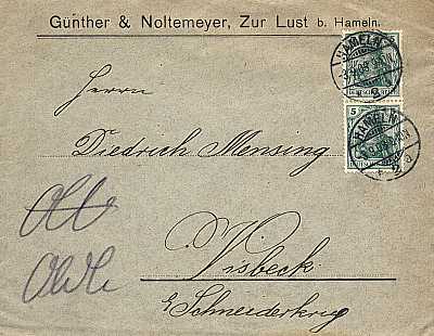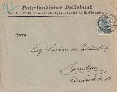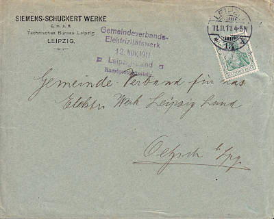 Local cover (1-250 g) from 11.11.1911 (1. Period) franked with one stamp a 5 Pfennig (=5 Pfennig) |