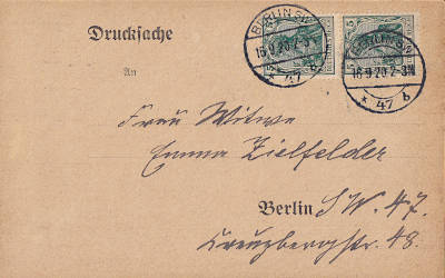 Inland printed matter (1-50 g) from 16.09.1920 (5. Period) franked with 2 stamps a 5 Pfennig (=10 Pfennig) |