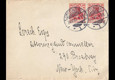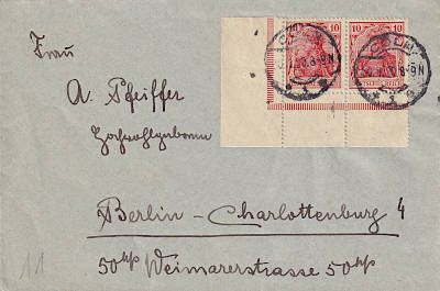 Inland cover (21-250 g) from 10.10.1910 (1. Period) franked with 2 stamps a 10 Pfennig (=20 Pfennig) |