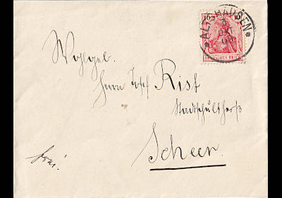Foreign cross-border cover (1-20 g) from 20.10.1915 (1. Period) franked with one stamp a 10 Pfennig (=10 Pfennig); to Switzer- land up to 30 km the inland fee was valid |