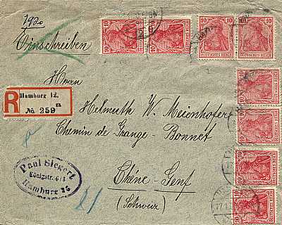 Foreign cover with registeration (21-40 g) from 17.01.1920 (4. Period) franked with 8 stamps a 10 Pfennig (=80 Pfennig, 50 cover 30 registeration) |