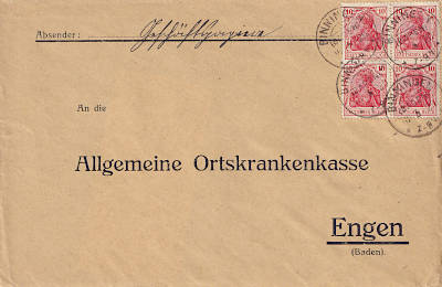 Inland business documents (1-250 g) from 10.06.1920 (5. Period) franked with 4 stamps a 10 Pfennig (=40 Pfennig) |