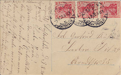 Inland postcard with special delivery from 06.03.1911 (1. Period) franked with 3 stamps a 10 Pfennig (=30 Pfennig, 5 postcard 25 special delivery) |