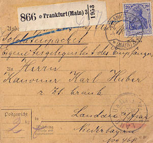 Inland parcel card for a soldier parcel (2 000 g) from 04.04.1917 (2. Period) franked with one stamp a 20 Pfennig (=20 Pfennig)