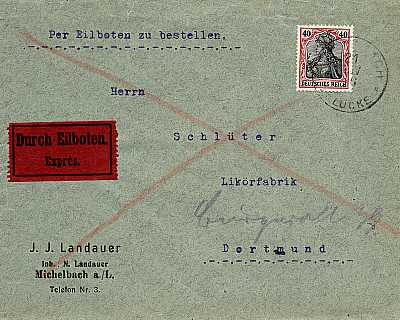 Inland cover with special delivery (1-20 g) from 21.11.1916 (2. Period) franked with one stamp a 40 Pfennig (=40 Pfennig, 15 cover 25 special delivery) |