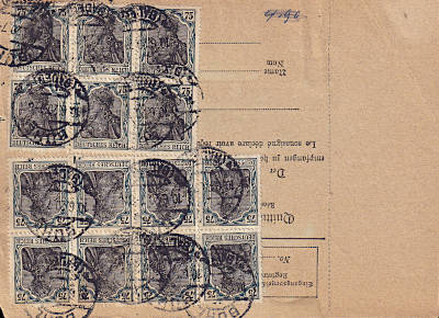 Foreign parcel card (5 000 g) from 10.06.1920 (5. Period) franked with 16 stamps a 75 Pfennig (=12 Mark)