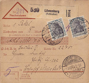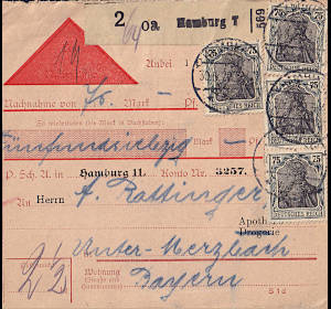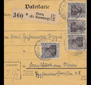 (2 500 g, > 75 km) from 30.08.1920 (5. Period) franked with 4 stamps a 75 Pfennig (=3 Mark, 2 parcel 1 cash on delivery)