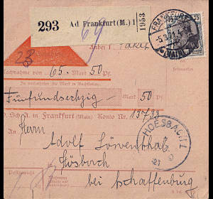 (5 000 g, > 75 km) from 26.11.1919 (4. Period) franked with 2 stamps a 75 Pfennig (=1,50 Mark, 1,25 parcel 0,25 cash on delivery)