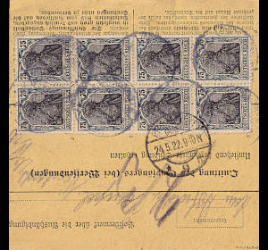 Inland parcel card (2 500 g, > 75 km) from 23.05.1922 (7. Period) franked with 12 stamps a 75 Pfennig (=9 Mark)