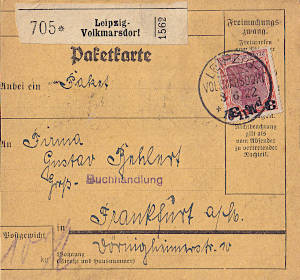 Inlandspaketkarte (2 000 g, < 75 km) vom 08.06.1922 (7. Periode) frankiert mit 2 Marken a 3 Mark auf 1¼ Mark (=6 Mark) |